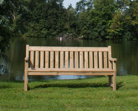 Un banc classique qui défie le temps, avec accoudoirs, en pin imprégné.