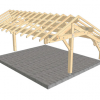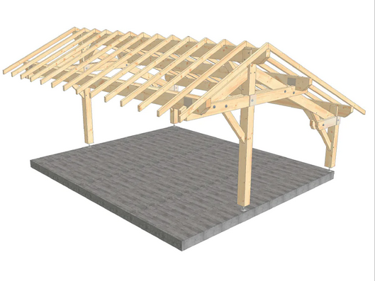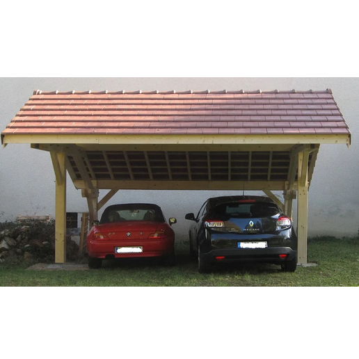 Auvent double pans inégaux sur poteaux en sapin raboté
