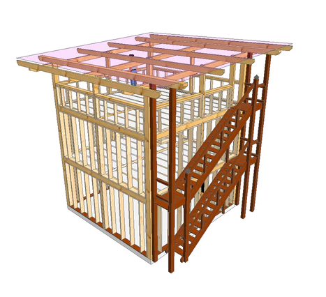 Le prix comprend toute la structure poteaux-poutres débitée comme sur la 3D et la visualisation 3D, Compris 2 solivages R+1 et R+2 en queues d’aronde sur les porteuses centrales.
