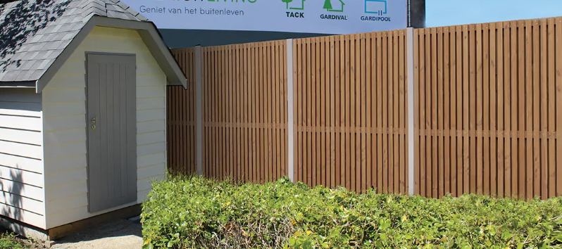 Caldeira est une clôture de jardin fermée en thermowood (sapin blanc) avec des lattes verticales rabotées.