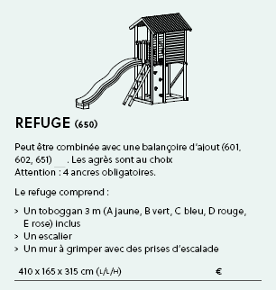 Peut être combinée avec une balançoire d’ajout ; le Refuge comprend :