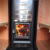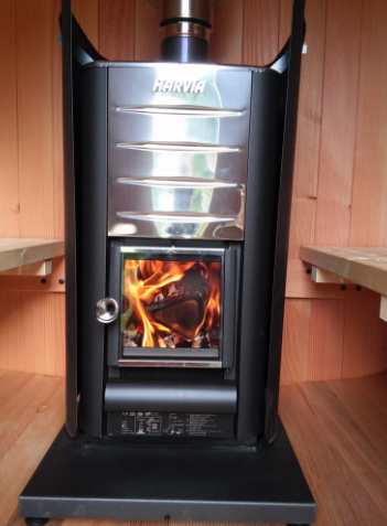– au bois avec un poêle de 16 kw (modèle M3 de chez Harvia) en fonte rempli de 30kg de pierres volcaniques avec protection en métal et cheminée en inox de chez Modinox ( made in France)