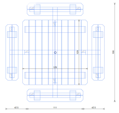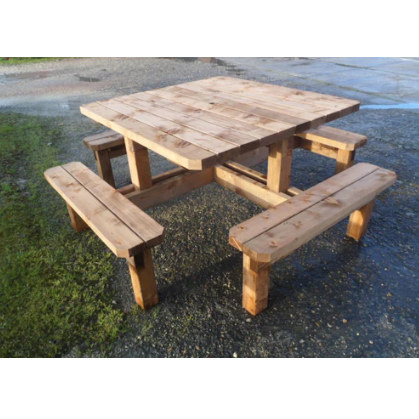 Table avec 4 bancs pour 8 personnes. Plateau en lames sapin d’épaisseur 45mm.